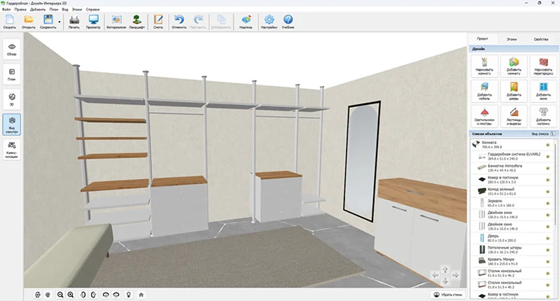 Удобная программа для ПК на Windows отлично подходит для планирования зон хранения. Нарисуйте точную схему помещения с учетом выступов, затем разместите системы для одежды и обуви. В каталоге программы есть модели гардеробов, полок, корзин, обувниц и другой мебели. А благодаря обширному каталогу текстур можно подобрать идеальное оформление помещения.