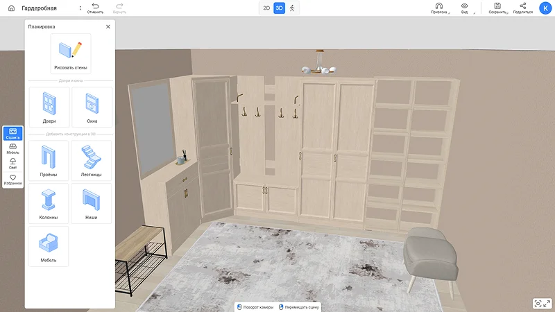 Бесплатный онлайн-сервис для дизайна интерьера и планировки помещений в объеме. Создавать гардеробную здесь удобно: можно нарисовать помещение любой формы, добавить ниши и перегородки, выбрать подходящую систему хранения — например, шкафы, полки, вешалки и т. д. Все это можно стилизовать текстурами из каталога.