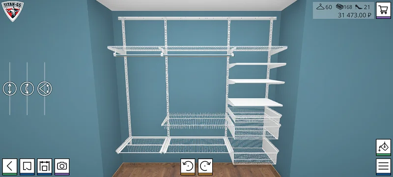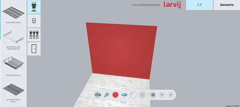 Сервис строится на возможностях регулируемого хранения Larvij (Великобритания). В программе предусмотрены системы с сетчатыми металлическими полками. Элементы адаптируются к размерам и особенностям пространства. Планировщик позволяет создать удобный гардероб и рассчитать его стоимость. План распечатывают и прилагают к заказу.