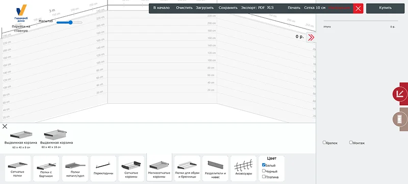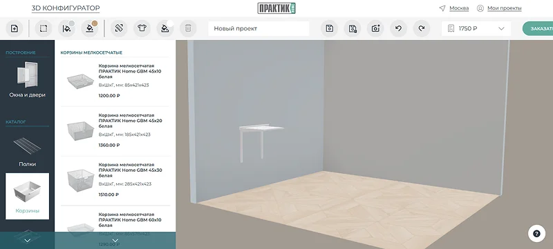 Сервис позволяет создать систему под ассортимент компании Практик Home — это сетчатые полки, консоли, стойки, штанги, корзины, выдвижные ящики, обувницы и другие элементы на металлическом каркасе.