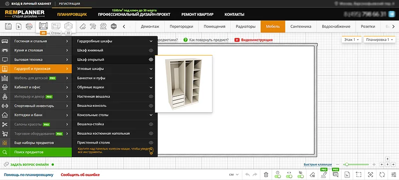 Самостоятельно и бесплатно нарисовать гардеробную онлайн можно с помощью сервиса RemPlanner. Программа работает не только с выделенной комнатой, но с целой квартирой. В встроенном каталоге софта представлен ассортимент материалов для отделки потолка, стен, пола и мебели.