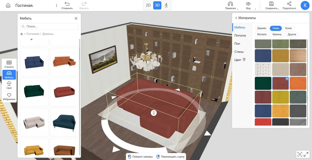 Предметы интерьера кастомизируются. Меняйте высоту, ширину, глубину объекта, выбирайте материал из каталога на 1250+ текстур. Вы также можете примерить на свой проект выкраски или ткани, которые вам выдали в магазине. Для этого достаточно сфотографировать образцы и загрузить их в программу.